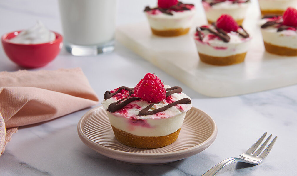 These no-bake mini cheesecakes combine cream cheese with the vibrant taste of raspberries and a swirl of chocolate, making each bite a delight.